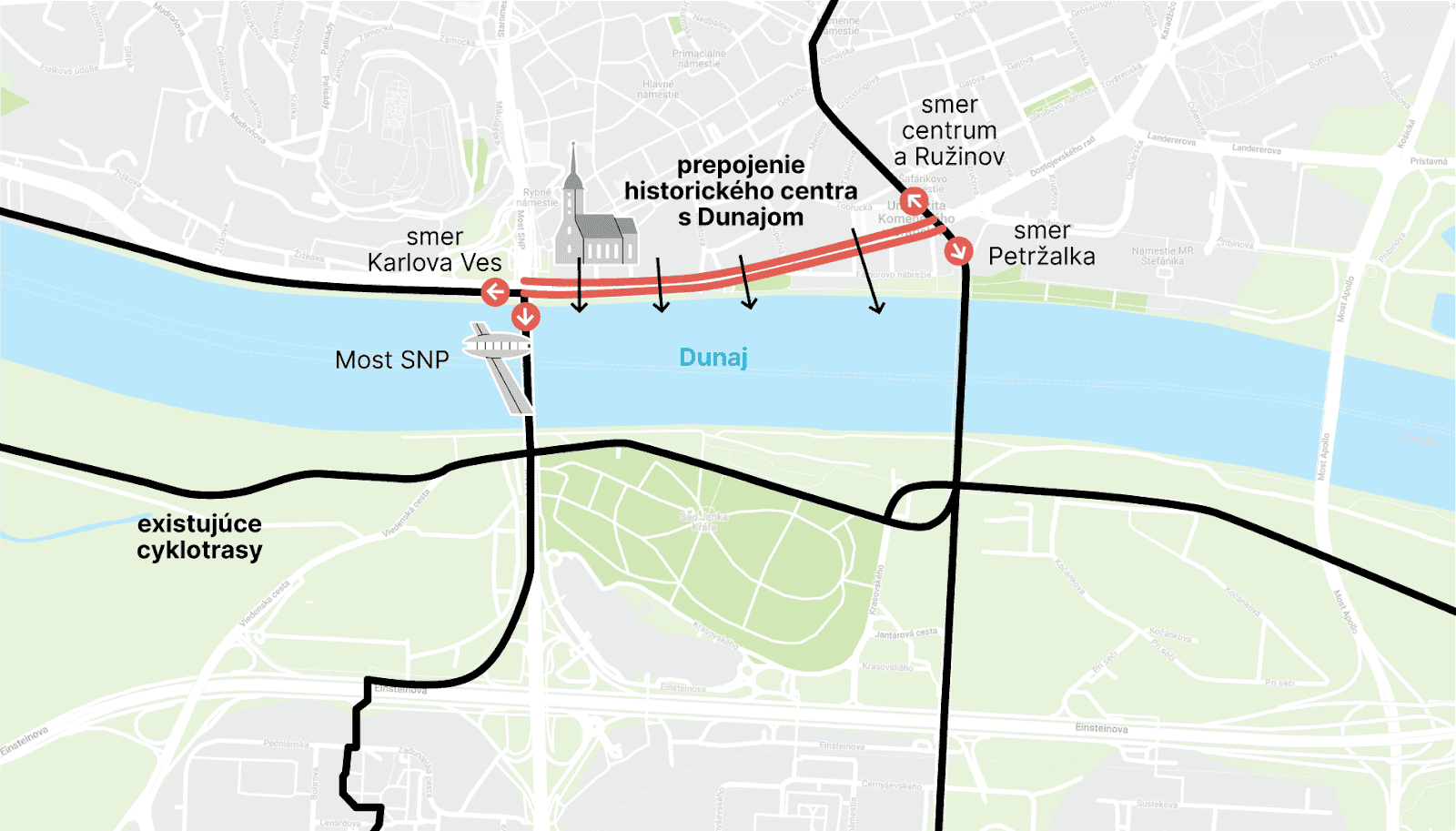 Cyklotrasa tu práveže nebola. Vyznačená cykloinfraštruktúra v smere od Karlovej Vsi, v podobe zmiešaného cyklochodníka, končí pri moste SNP. Odtiaľ nasleduje už len frekventovaný chodník pre peších. Nové cyklopruhy na Vajanského a Rázusovom nábreží priamo a bezpečne prepájajú cyklistickú infraštruktúru v smere z Karlovej Vsi do centra mesta s ďalším pokračovaním na Ružinov a Nové Mesto a tiež prípojnú cyklistickú infraštruktúru do Petržalky a ďalej v smere toku Dunaja.